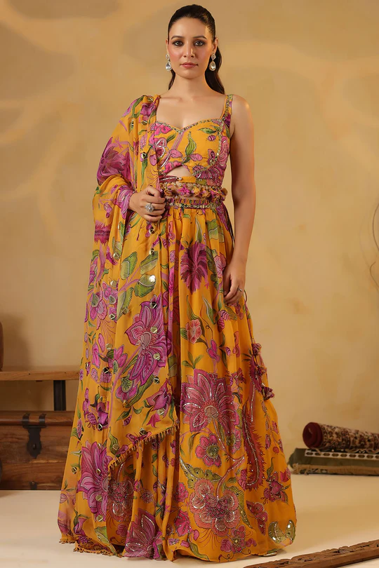 Ready to rule the festivities? This opulent Mustard Georgette Lehenga Set is all about celebrating your spotlight moment with elegance and flair. The airy drape of georgette keeps you twirling comfortably from haldi rituals to the pheras. Its fluid texture adds movement and grace, perfect for those Insta-worthy slow-mo spin. The digital floral print bursts with vibrancy, while sequin and beadwork create layers of sparkle that catch every light. The mirror embellishments add that irresistible shimmer—think radiant charm in motion. The digitally printed dupatta completes the ensemble with finesse, adding a splash of contrast or harmony depending on how you drape it. Whether you’re the sister of the bride or part of the bride tribe, this look adapts seamlessly to mehendi, cocktail night, or the big day itself.Note: Colour may slightly differ from the actual item due to photographic lighting sources or the monitor’s settings.