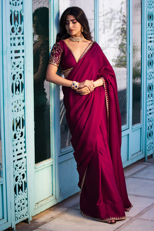 Wine Satin Embroidered SareeWine Satin Embroidered Saree
